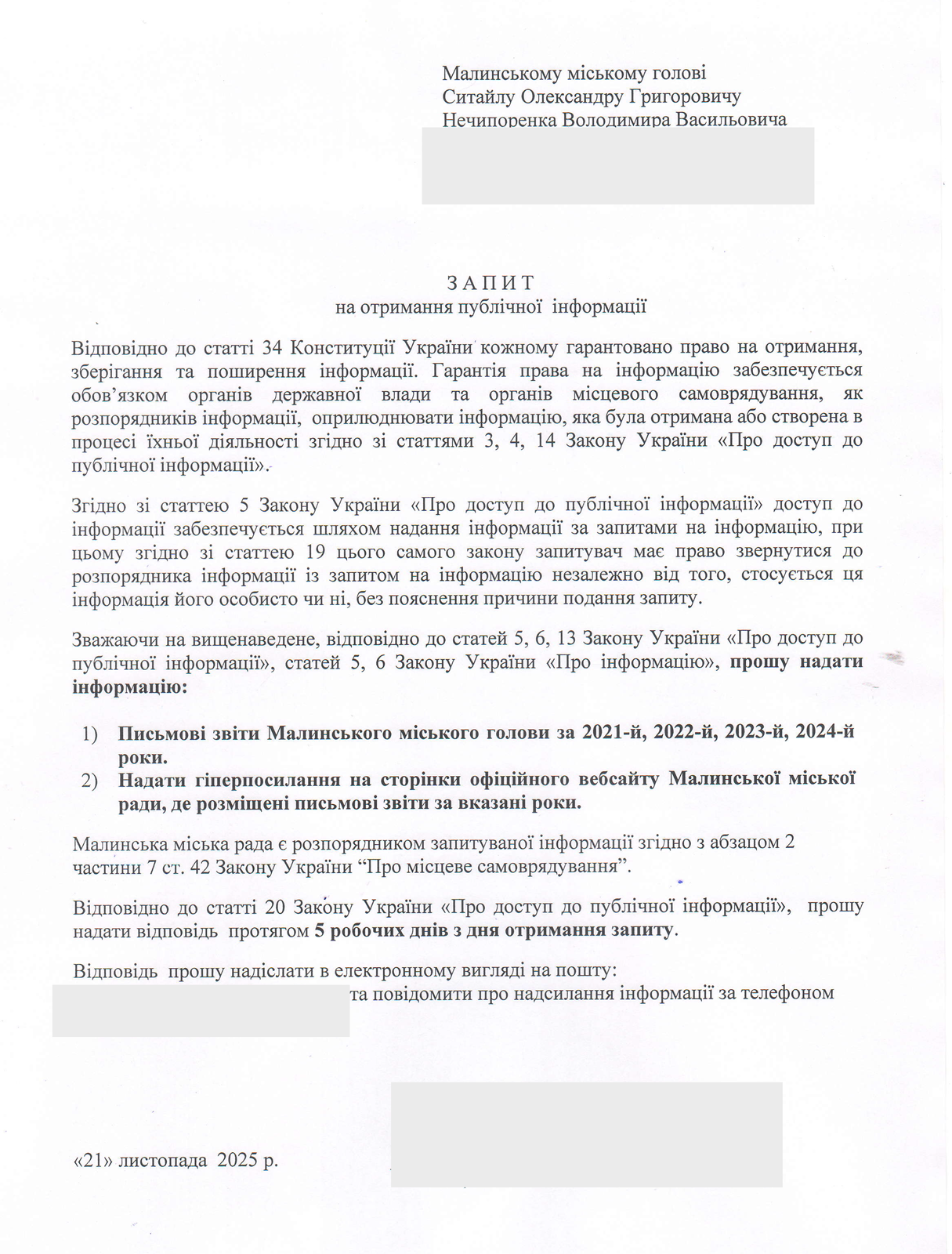 — письмові звіти Малинського міського голови за 2021-й, 2022-й, 2023-й та 2024-й роки; — гіперпосилання на офіційний вебсайт Малинської міської ради, за якими були розміщені названі звіти.