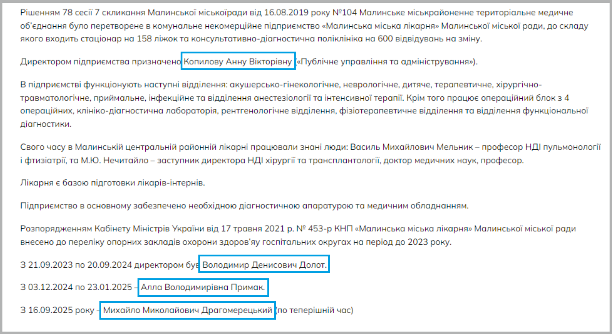 У контексті калейдоскопу директорів лікарні побачили одну цікаву деталь на оновленому сайті КНП «Малинська міська лікарня». В розділі «Історична довідка» за п’ятирічку Олександра Ситайла ми бачимо лише чотирьох директорів лікарні: Копилову, Долота, Примак, Драгомерецького…
