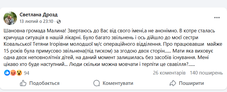Відправною точкою став допис у Facebook Світлани Дрозд — сестри звільненої працівниці. У ньому йшлося про те, що після багатьох звільнень у лікарні черга дійшла і до її сестри — Тетяни Ковальської.